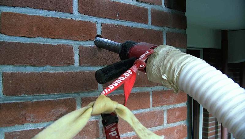 Für die Kerndämmung erfolgt in der Regel das Einblasen von SLS20 in die Luftschicht mit unserer eigenen Einblasmaschine. Der Dämmstoff wird dabei mit einem Gebläse durch einen speziellen Einblasschlauch transportiert. Am Ende des Schlauches gelangt der Dämmstoff über eine 26 mm Düse zwischen das Mauerwerk. Durch die Förderluft läßt sich das leichte Dämmmaterial in geschlossenen Luftschichten maschinell verdichten. Der Dämmstoff kann dadurch bei einem späteren Bauelementewechsel nicht aus der Wand auslaufen.