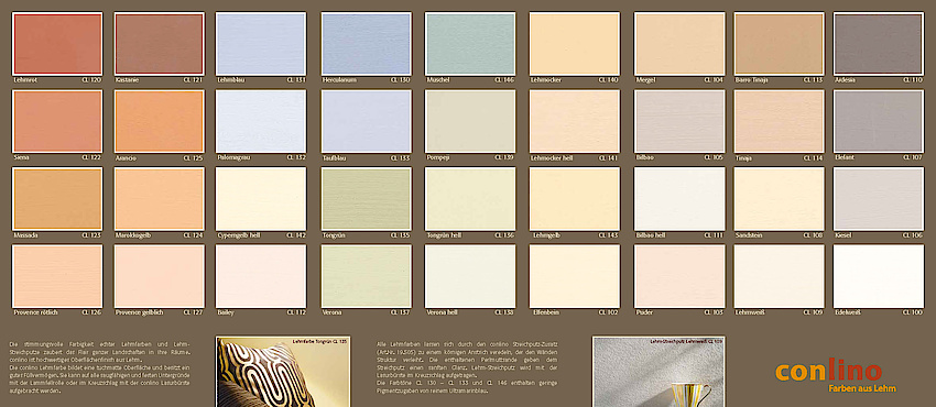 conlino Lehmfarbe ist in 36 Farbtönen erhältlich, siehe conlino Farbkarte für Lehmfarben. Alle conlino Farbtöne sind untereinander mischbar. Ebenso besteht die Möglichkeit, die Lehmfarbe mit Pigmenten (bis 8 % Zugabe) abzutönen. Dabei die Pigmente vor Anrühren der Farbe klümpchenfrei direkt in das Ansetzwasser einrühren, bzw. zum Nachtönen mit etwas Wasser anschlämmen und der fertigen Lehmfarbe beimischen.