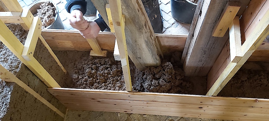 Fertige Leichtlehmmischung wird erdfeucht in die Schalung gedrückt